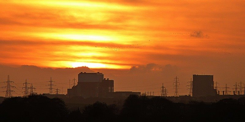 Sunset over 1980s-built nuclear plants in Heysham, UK, that have been granted life extensions. |