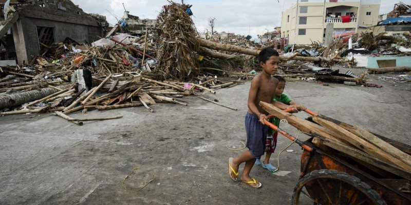 Boys scavenging for timber to build shelter after Typhoon Haiyan devastated coastal areas of the Philippines in 2013 |