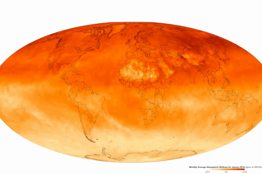 Map showing global methane concentrations in January 2016 at a pressure of 400 hectopascals, or roughly 6km above the surface. Concentrations are higher in the northern hemisphere because both natural- and human-caused sources of methane are more abundant there |