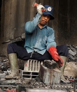 A man in Tegal, Indonesia, uses a hammer to break up used lead-acid batteries |