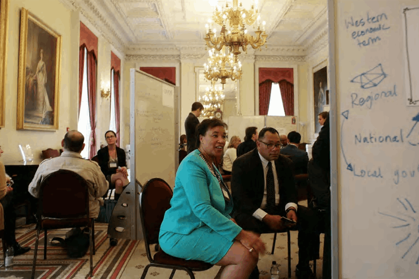 Commonwealth secretary general Patricia Scotland engages in discussion with scientists at the climate-change reversal workshop in London |