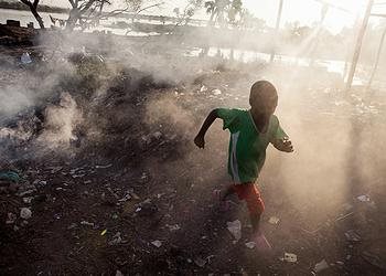 A boy runs through the smoke of burning garbage near the Niger River in Bamako, Mali |