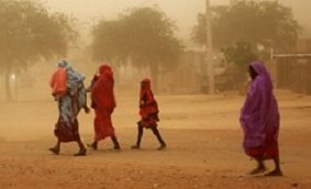 Women and children struggle through a dust storm in North Darfur, Sudan |