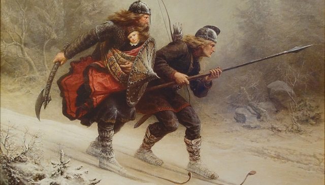 Detail from a painting by Norwegian artist Knud Larsen Bergslien of skiers escaping from Lillehammer in 1206 with two-year-old Håkon Håkonsson, the future king |
