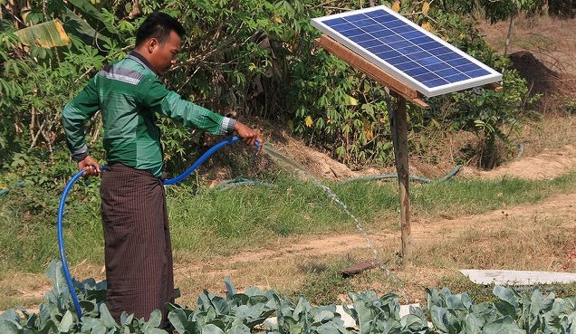 A farmer in Myanmar waters his crop with the help of a solar-powered irrigation pump | Ashden |