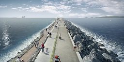 Tidal lagoons work by using a wall to capture a body of water in the sea or a tidal estuary pushed in on the rising tide. The water drives turbines as the tide comes in, and then, as the tide falls, the turbines are reversed and the energy from the falling tide is harnessed again.