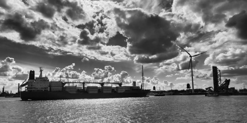Dark clouds gather over a container ship in the Belgian port of Antwerp | August Brill |
