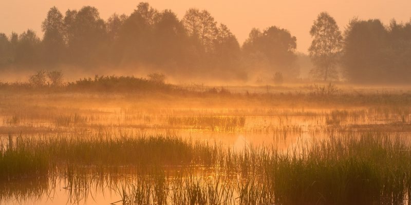 Early morning mist rises from a lake in Poland’s Kampinos national park |