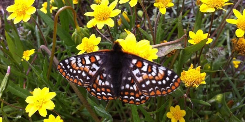 An endangered Bay checkerspot butterfly on a California goldfields flower within the Coyote Ridge experimental site | Amy Wolf |