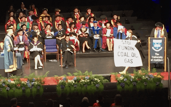 ANOTHER Auckland University student has turned what might have been the biggest moment of her life to date – graduation – into a protest against the university’s investment in fossil fuels.