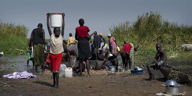 Displaced people collecting water on the banks of the River Nile, South Sudan | Geoff Pugh |