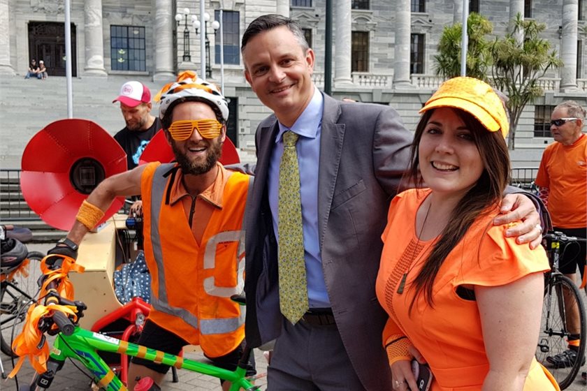 Climate change minister James Shaw with GenZero cyclist Sam Dyson and Zero Carbon Act co-ordinator Lisa McLaren |