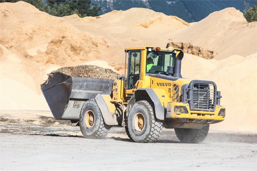 A loader transports biomass fuel at Azwood Energy’s Tasman Fuel Hub at Brightwater |