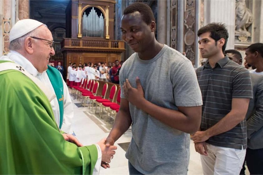 Pope Francis is greeted by a migrant at aVatican mass