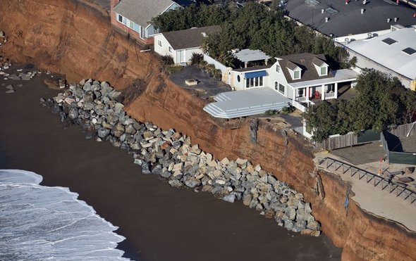 Houses hang over a cliff in Pacifica, California, that was eroded by storms and powerful waves in 2016