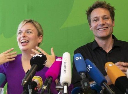 Katharina Schulze and Ludwig Hartmann, leaders of the German Green party at a press conference in Munich
