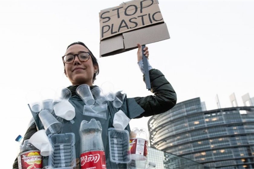 A French protester wearing a suit made of plastic bottles, cups and containers holds a placard while joining a demonstration against plastic waste