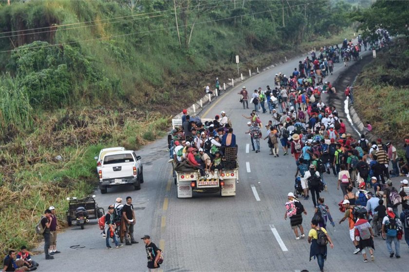 Honduran migrants taking part in a caravan heading to the US walk alongside a road in Mexico