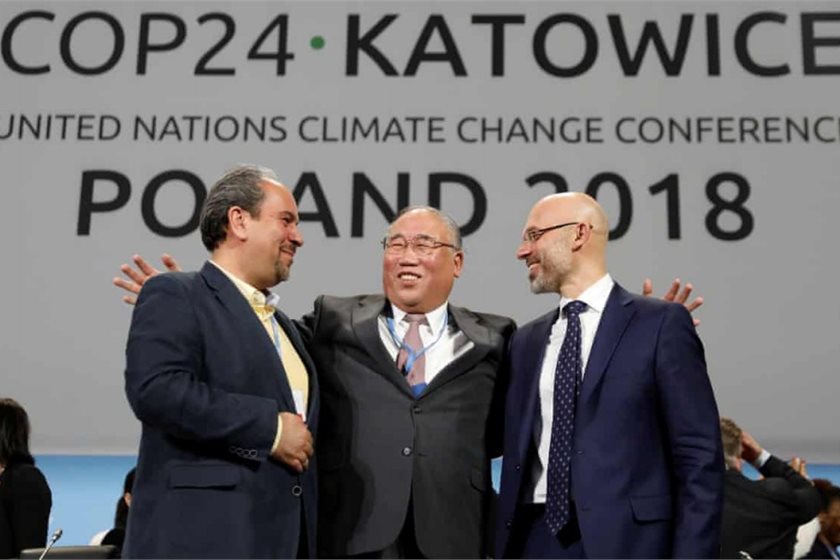Iran’s Majid Shafiepour Motlagh, China’s Xie Zhenhua and COP24 president Michal Kurtyka celebrate after adopting the final agreement in Katowice