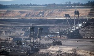 Bucket wheel excavators dig into the earth at the Garzweiler open pit lignite mine in western Germany.