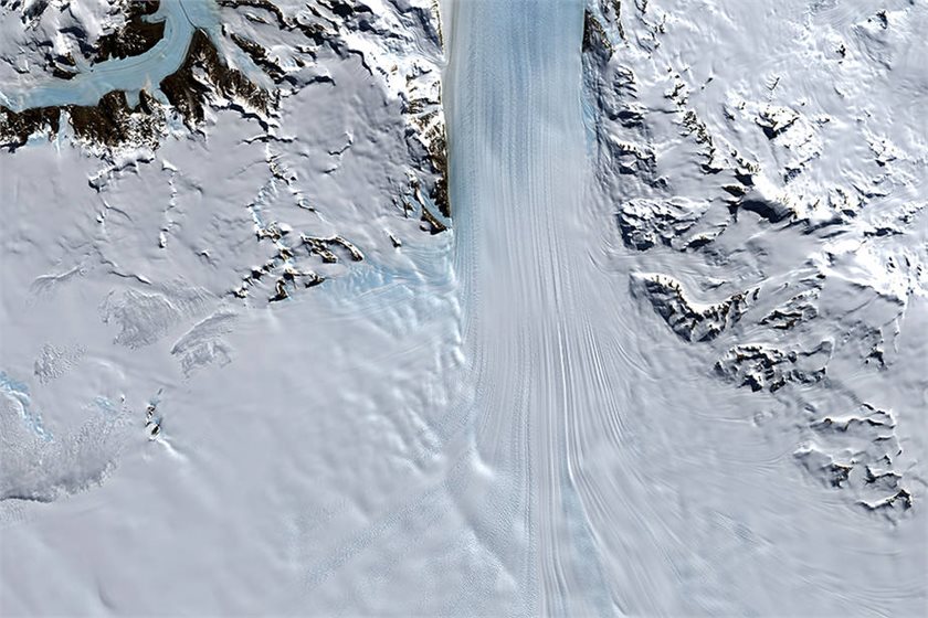A satellite image shows Antarctica's Byrd Glacier flowing into the Ross Ice Shelf