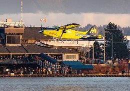The converted DHC-2 de Havilland seaplane flew for three minutes along the frozen Fraser River after taking off from Harbour Air’s sea terminal at Richmond, Vancouver.