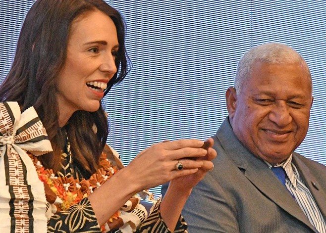 Jacinda Ardern takes a bowl of yaqona with Fiji leader Frank Bainimarama |