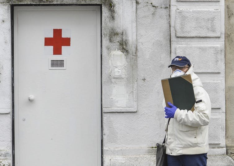 The entrance of a former military hospital in Milan, Italy, to which COVID-19 patients are being transferred.