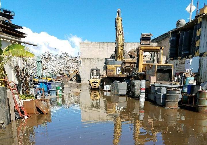 At Mike Leary's Island Demo's equipment yard, more frequent tidal flooding from rising seas has inundated the property in recent years