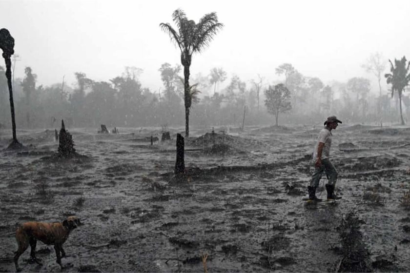 A farmer and his dog in a burnt region of the Amazon rainforest in Rondônia state, Brazil