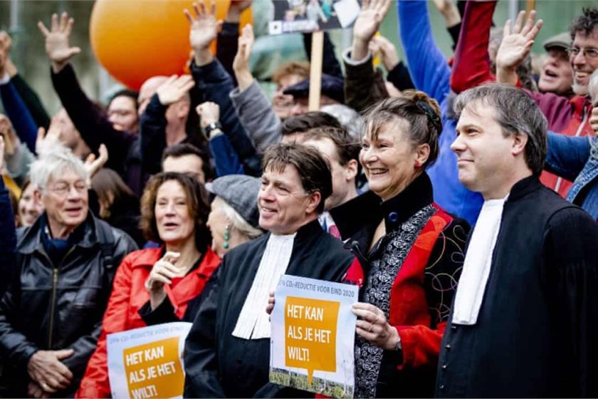 Marjan Minnesma (second right) in a crowd outside the Dutch supreme court before its ruling in the Urgenda case in December