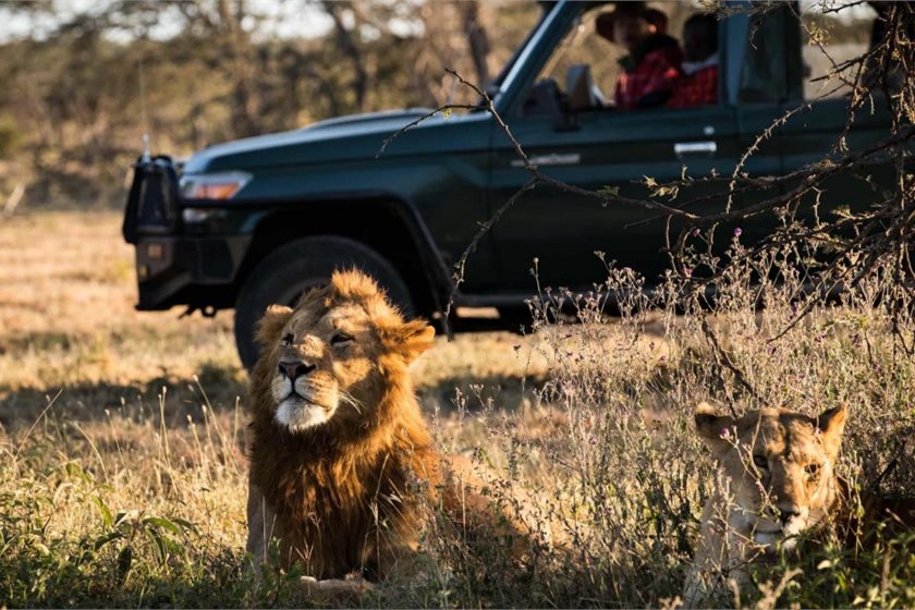 Chinese wildlife conservationist Zhuo Qiang and a local warden check lions at Ol Kinyei |