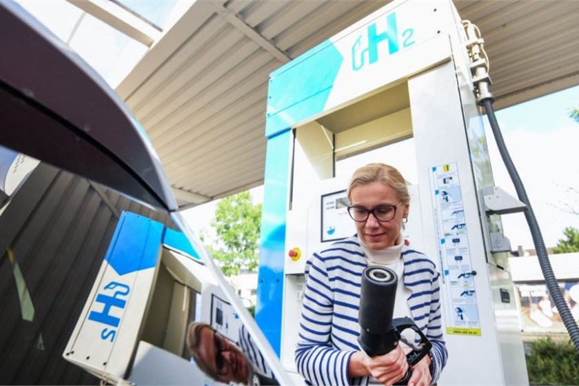 Kadri Simson, Commissioner for Energy, fills up a hydrogen car.