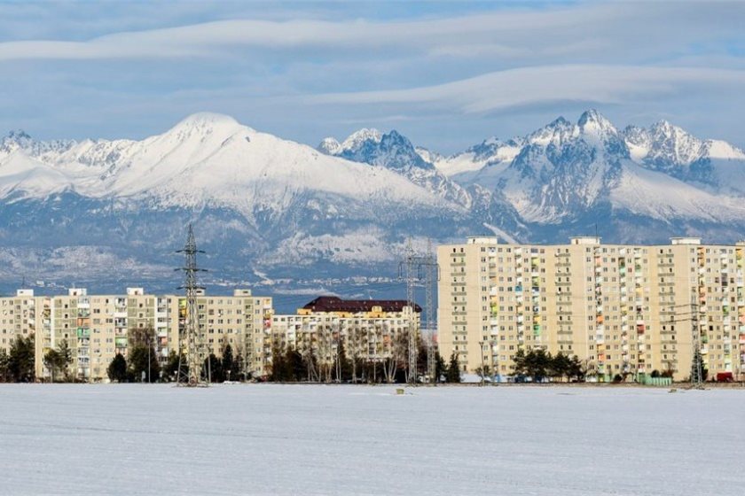 Peaks of the High Tatras in the background of apartment blocks in northern Slovakia