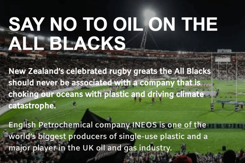 Media Release - Greenpeace is squaring up to tackle NZ Rugby over the sporting body’s reported intention to sign up INEOS, a petroleum giant and "merchant of plastic pollution", as a sponsor for the All Blacks, Black Ferns, Mâori and other national rugby sides.