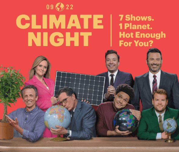 CLIMATE CHANGE, which is responsible for magnifying this summer's deadly heat waves, hurricanes, wildfires and floods, is typically no laughing matter. But for one night, seven popular late-night comedy shows hope they can change that.