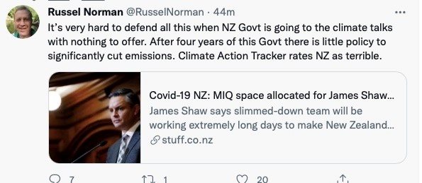 THE National and ACT parties weren't the only ones, last week, criticising climate minister James Shaw's decision to travel to COP26 in November. Former Green Party co-leader, and current Greenpeace executive director, Russel Norman took to Twitter saying New Zealand had nothing to offer at the talks.