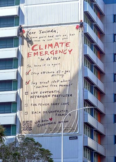 Media Release - On the one-year anniversary of Jacinda Ardern’s Climate Emergency declaration, Greenpeace has positioned a cheeky, four storey high, crowdfunded "climate emergency to-do list" on a wall near Parliament in Wellington.