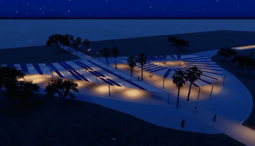 Resembling something between a satellite dish and a ship’s sail, the structure known as LumiWeave is made of an innovative lightweight fabric designed to provide shade during the day and solar-powered lighting once the sun sets in the Israeli city.