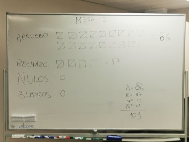 | A white board with the results of one of three tables at the Wellington voting centre |
