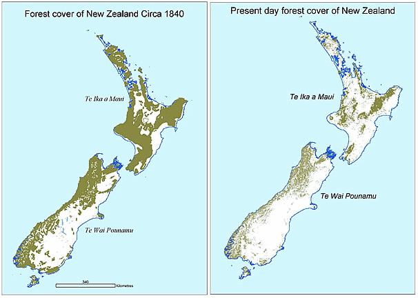 | A comparison of forest cover before the British established a colony in New Zealand (left) versus today (right). Image: Decolonial Atlas |