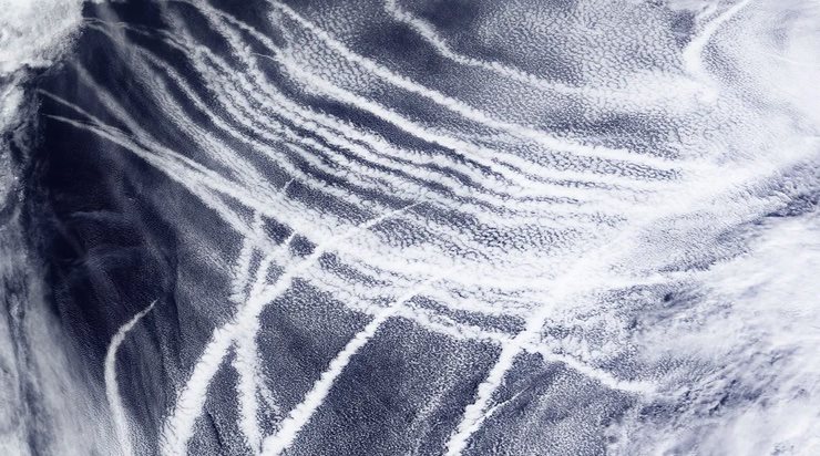 The fuel oil that runs these immense vessels can contain up to 3,500 times more sulfur than the diesel that is used for land vehicles. When the fuel is burned, large amounts of sulfur oxides and other aerosols are released into the atmosphere. These aerosols increase the concentration of droplets in marine low clouds, which makes them appear brighter. These bright clouds trail ships and can be seen in satellite images.