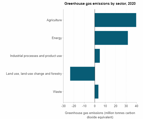 Agriculture was the biggest gross emitter at 39.5 million tonnes CO2e, contributing more than half of the total (50.1%), followed by energy at 31.5 CO2e million tonnes, or 38.8%.