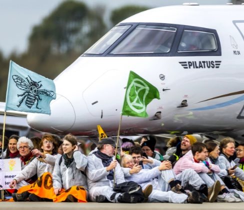 Greenpeace and Extinction Rebellion protesters sat around private jets to prevent them leaving and others rode bicycles around the planes.
