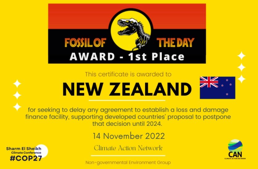 Less than a week after the government boasted of being one of just three countries in the world to commit to loss and damage funding, New Zealand has been awarded the ‘fossil of the day award’ for opposing an agreement at COP27 to establish a loss and damage finance facility.