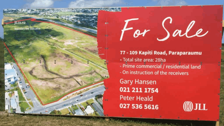 The Paraparaumu land is for sale due to a bankruptcy, and is advertised as prime commercial or residential land.