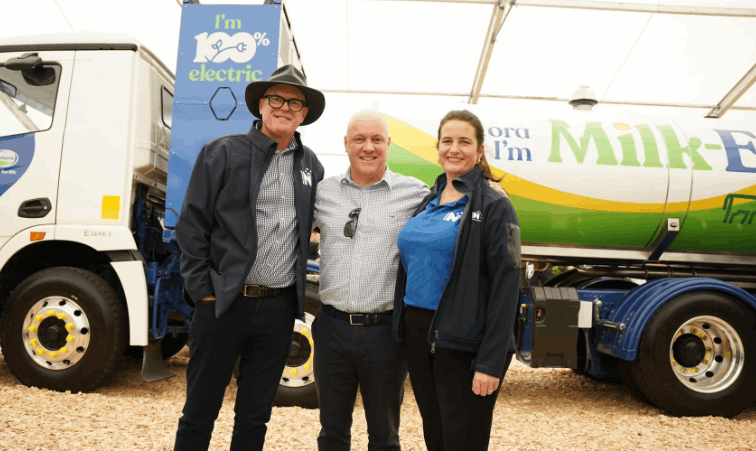 | Todd Muller, National leader Christopher Luxon, deputy leader Nicola Willis, and Fonterra's electric milk tanker at Fieldays last month. |