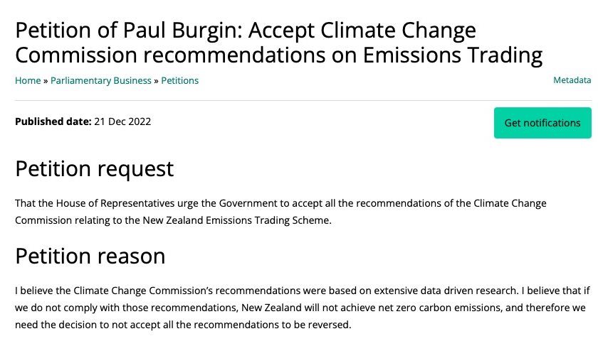 Burgin writes in his explanation for the reason for the petition: “I believe the Climate Change Commission’s recommendations were based on extensive data driven research. I believe that if we do not comply with those recommendations, New Zealand will not achieve net zero carbon emissions, and therefore we need the decision to not accept all the recommendations to be reversed.”