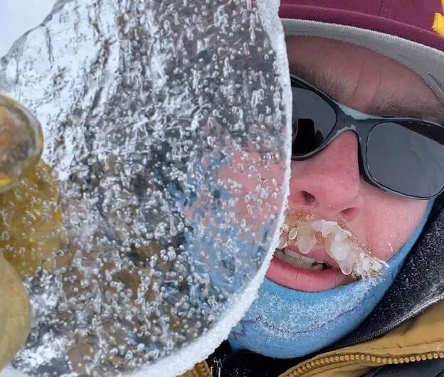 With his moustache caked in icicles and frozen droplets, glaciologist Peter Neff shows his 220,000 TikTok followers a sample of old ice excavated from Antarctica's Allan Hills.