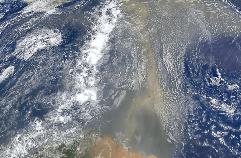 | Above: A satellite captured this image of Saharan dust blowing toward South America in 2014. Credit: NASA |